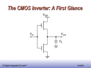 The document discusses the CMOS inverter, including its basic structure and operation, transient response characteristics, voltage transfer curve, propagation delay, and design considerations for improving performance such as minimizing delay. It provides analysis of how varying factors like transistor widths, supply voltage, and load capacitance affect the inverter's switching threshold, rise/fall times, and propagation delay. The goal of the analysis is to determine the optimal transistor width ratios and device parameters needed to design a high-performance symmetric CMOS inverter with minimum total propagation delay.