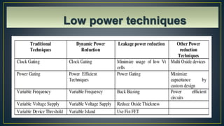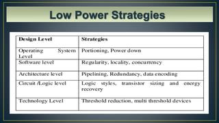 Low power VLSI design has become important due to increasing integration leading to higher power consumption. Low power design is essential for handheld devices to allow long battery life and better performance. There are various techniques for low power design including reducing supply voltage, minimizing capacitance and switching activity, and employing strategies like clock gating and power gating. Low power design can be achieved at different levels from system to logic to physical design.