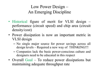Low power VLSI design has become an important discipline due to increasing device densities, operating frequencies, and proliferation of portable electronics. Power dissipation, which was previously neglected, is now a primary design constraint. There are several sources of power dissipation in CMOS circuits, including switching power due to charging and discharging capacitances, short-circuit power during signal transitions, and leakage power from subthreshold and gate leakage currents. Designers have some control over power consumption by optimizing factors such as activity levels, clock frequency, supply voltage, transistor sizing and architecture.