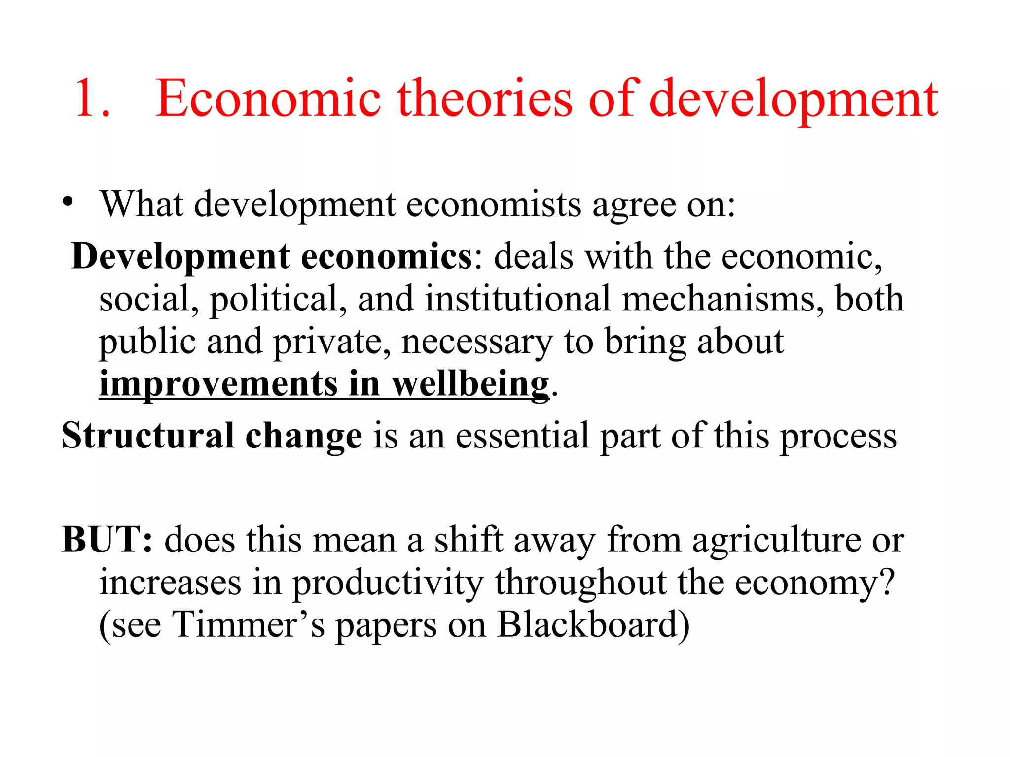 The document discusses the history of economic theories of development from the 1940s to present. Early theories focused on issues like low savings, population growth, and structural changes needed in developing economies. Later theories examined political and social factors, terms of trade, and the experiences of newly industrialized countries. More recent debates center around the Washington Consensus of free market policies versus structuralist and developmental state approaches of different countries. The document also discusses concepts of sustainable development and biophysical/ethical limits to unlimited economic growth. It concludes by discussing alternative definitions of development focused on well-being, needs, and ensuring future generations can meet their needs.