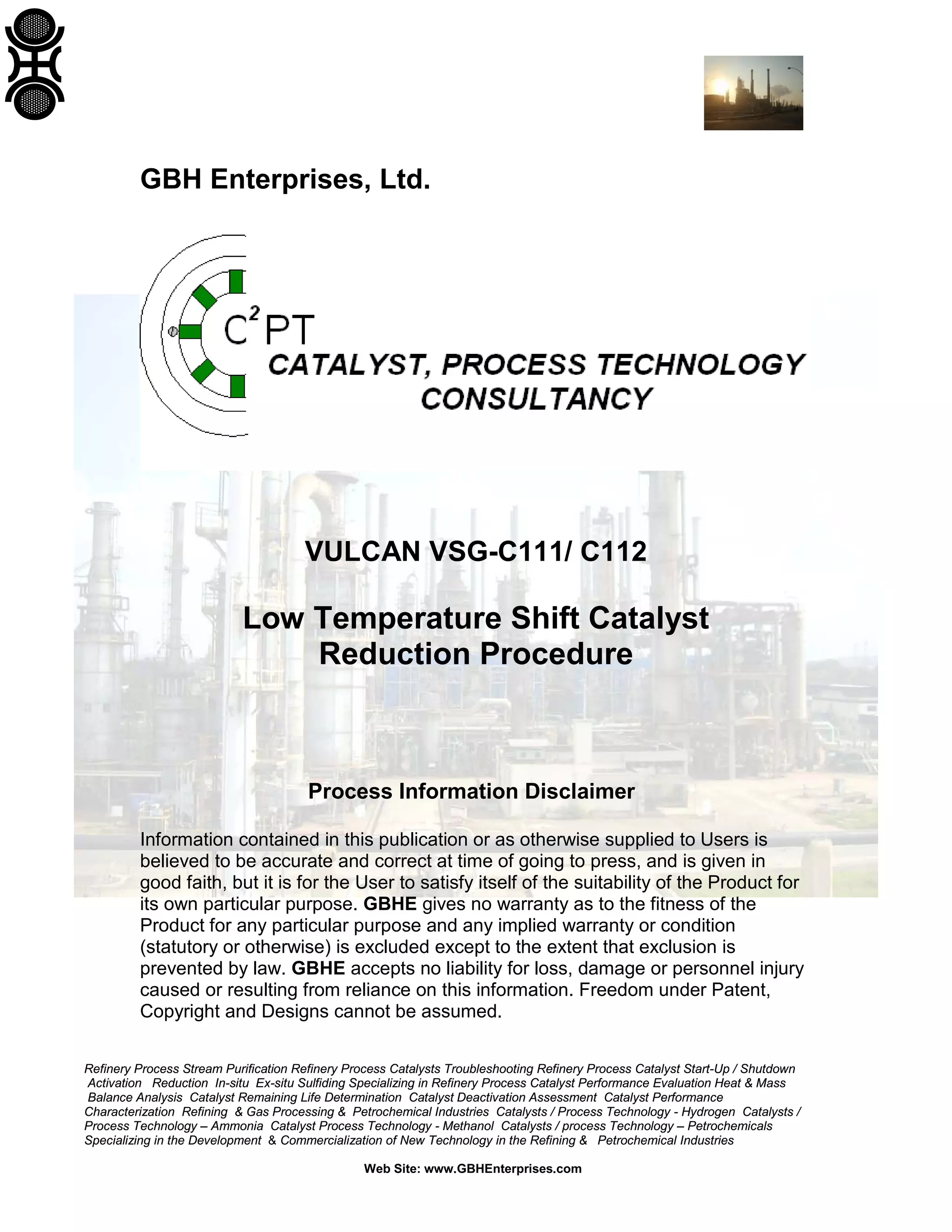 The document outlines the reduction procedure for the Vulcan VSG-C111/C112 low temperature shift catalyst, emphasizing the importance of controlled conditions to avoid thermal damage during the process. It details the steps required for safely activating the catalyst, including temperature management and gas flow specifications, and provides contingencies for potential issues like excessive temperature rises. The document also highlights key equipment requirements and safety considerations for successful catalyst performance in refining and petrochemical industries.