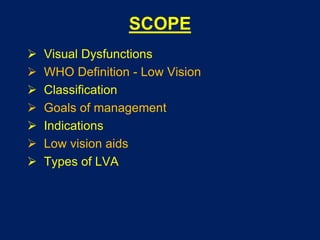 This document discusses low vision aids and their use for people with visual impairments. It defines low vision according to the WHO and describes common causes of visual dysfunction like macular degeneration and glaucoma. The goals of low vision rehabilitation are to maintain and improve visual function through clinical assessment and optometric intervention. Low vision aids can be optical devices like magnifying glasses, telescopes, or non-optical devices that alter lighting, contrast and size of objects. Common optical devices discussed include magnifying spectacles, hand magnifiers, stand magnifiers, and telescopes.