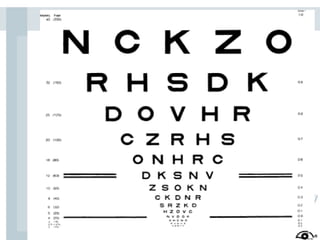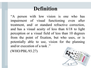 This document discusses low vision aids and their use for people with low vision. It defines low vision as visual acuity between 6/18 and 3/60 in the better eye after correction, or a field of vision between 20 to 30 degrees. Common causes of low vision include macular degeneration, glaucoma, and diabetic retinopathy. Optical low vision aids like magnifying spectacles, hand magnifiers, and telescopes use magnification to improve vision. Non-optical aids include increased lighting, contrast enhancement, and electronic magnifiers. Proper evaluation and prescribing of low vision aids depends on the patient's needs, vision status, and motivation. The goal is to prescribe simple, portable devices to help low vision