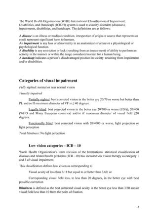 The document discusses various aspects of visual impairment, including definitions, types, and classifications based on conditions causing vision loss. It outlines rehabilitation methods to enhance the independence and quality of life for visually impaired individuals, emphasizing a multidisciplinary approach involving ophthalmologists, optometrists, and rehabilitation specialists. Additionally, it details low vision aids and therapies aimed at maximizing visual function and addressing the specific needs of patients with different types of visual impairment.