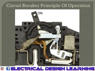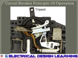 This document discusses circuit breakers, including their purpose, construction, types, sizing and selection factors. It provides information on: