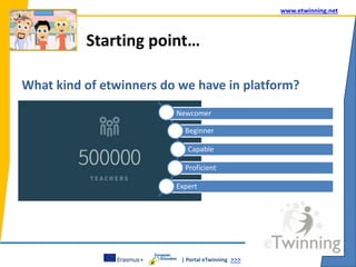 This document discusses eTwinning and low-cost collaborative projects. It describes an example low-cost project between two schools that focused on volcanoes and earthquakes. The project involved two classes, two teachers, and curricular integration over a short term. Students worked in teams on tasks and assessments. Smartphones were used to do classroom assessments. These types of low-cost projects can help engage more teachers and increase the number of eTwinning projects by making collaboration accessible.