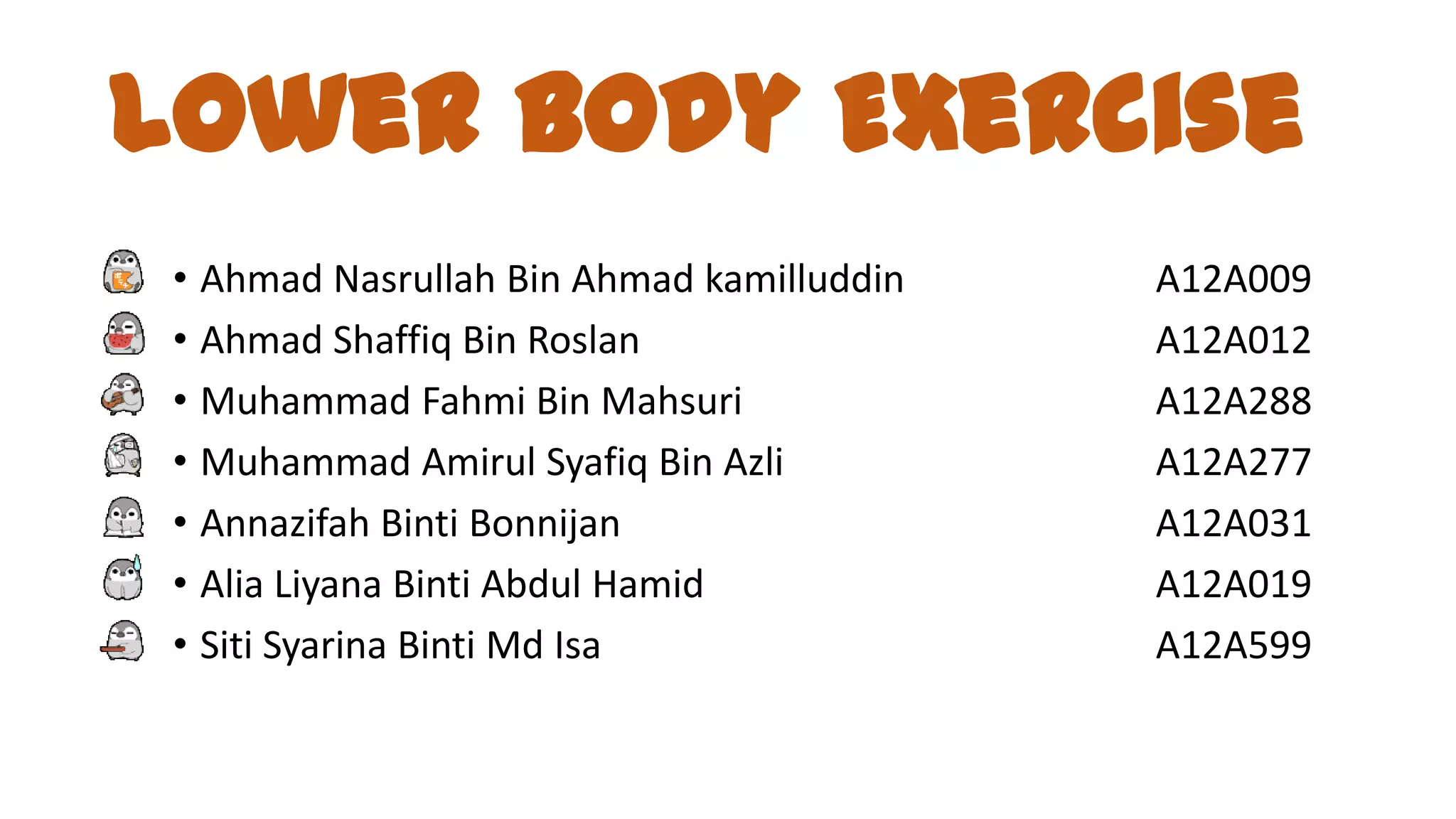 This document provides information about lower body exercises and common knee injuries. It lists the major muscles of the lower body and describes exercises that target the thighs, hamstrings, glutes, calves, and hips. Exercises are described both without equipment and with equipment like barbells, dumbbells, exercise balls, and machines. Common knee injuries discussed include fractures, dislocations, collateral ligament injuries, and tendon tears. Treatment options like immobilization, physical therapy, and surgery are also summarized.