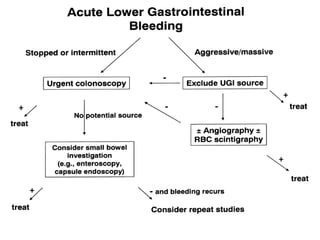 - Colonoscopy is the gold standard for diagnosis and treatment but must be performed carefully in unstable patients. Angiography and nuclear scans can help localize bleeding in severe cases.
