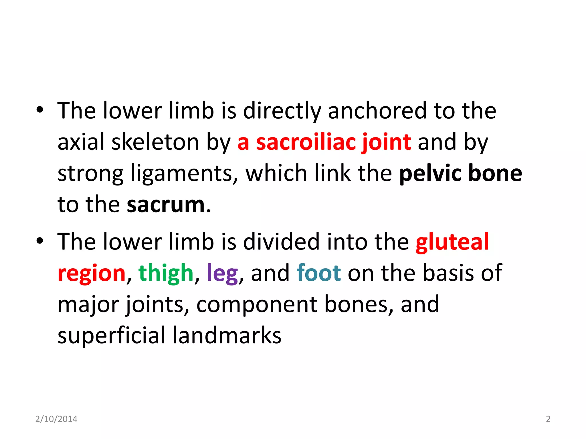 The document summarizes the anatomy of the lower extremities. It describes the bones and regions of the lower limb, including the pelvis, thigh, leg, and foot. It outlines the bones that make up the pelvis (hip bones, sacrum, coccyx), and provides details on the ilium, ischium, pubis, acetabulum, and other structures of the hip bone. It also describes the femur, including the head, neck, greater and lesser trochanters. The document emphasizes the anatomical landmarks and functional aspects of the lower extremity bones.