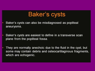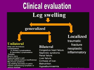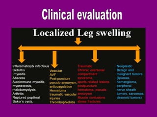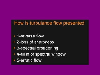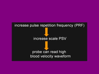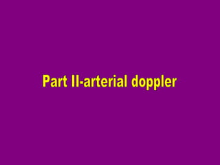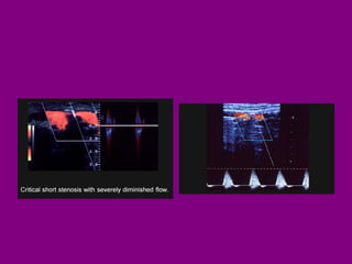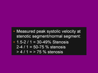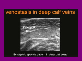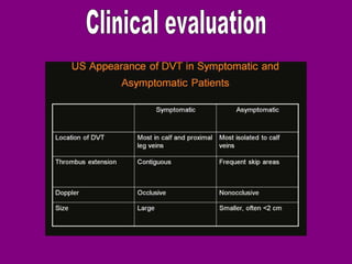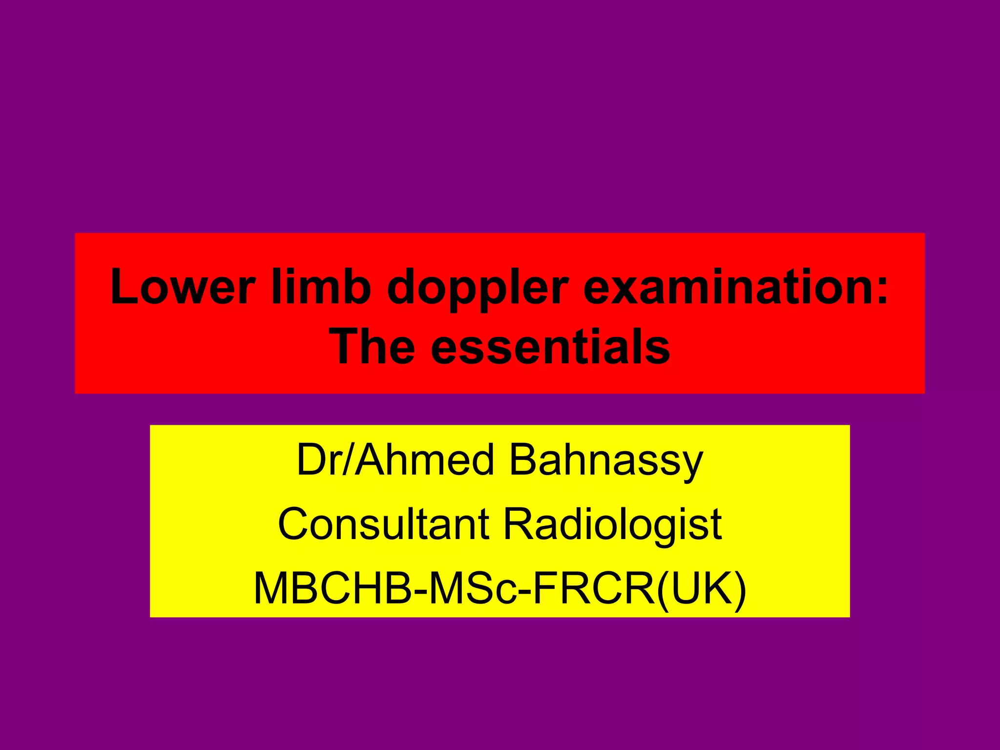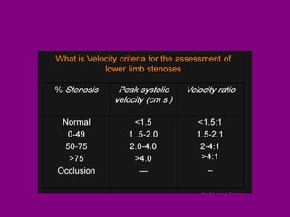 This document provides an overview of performing lower limb doppler examinations to diagnose deep vein thrombosis and other causes of limb pain. It discusses the essential techniques including recognizing the vessels, avoiding pitfalls, applying compression, and following the anatomy. Criteria for diagnosing DVT include vessel expansion, compressibility, presence of thrombus, and absent or reduced blood flow waves. The document also reviews using doppler to diagnose and grade arterial stenosis by analyzing spectral wave patterns and meanings.