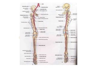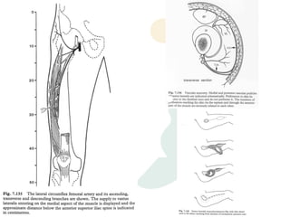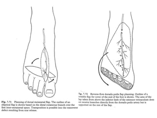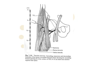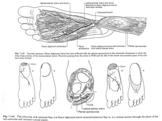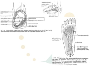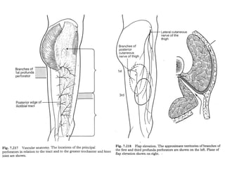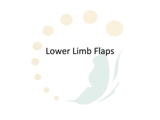 This document describes the arterial blood supply and potential flaps in the lower limb. It discusses various fasciocutaneous and musculocutaneous flaps that can be raised based on named arteries in the lower limb, including the femoral, lateral circumflex femoral, profunda femoris, popliteal, and posterior tibial arteries. Specific flaps are described such as the anteromedial thigh flap, gracilis flap, and gastrocnemius flap. The angiosome concept and variations in vascular anatomy are also covered.