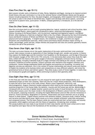 The document provides an overview of the curriculum in each year/class of a Steiner Waldorf lower school from ages 6-14. It describes how the curriculum is designed to align with children's developmental stages, focusing on creative, imaginative and active learning in the early years. Key aspects include a daily main lesson immersed in one subject for 3-4 weeks, and an emphasis on language, math, history, geography, science, arts and crafts. The curriculum content progresses to more abstract concepts as the children get older, preparing them for the secondary school level.