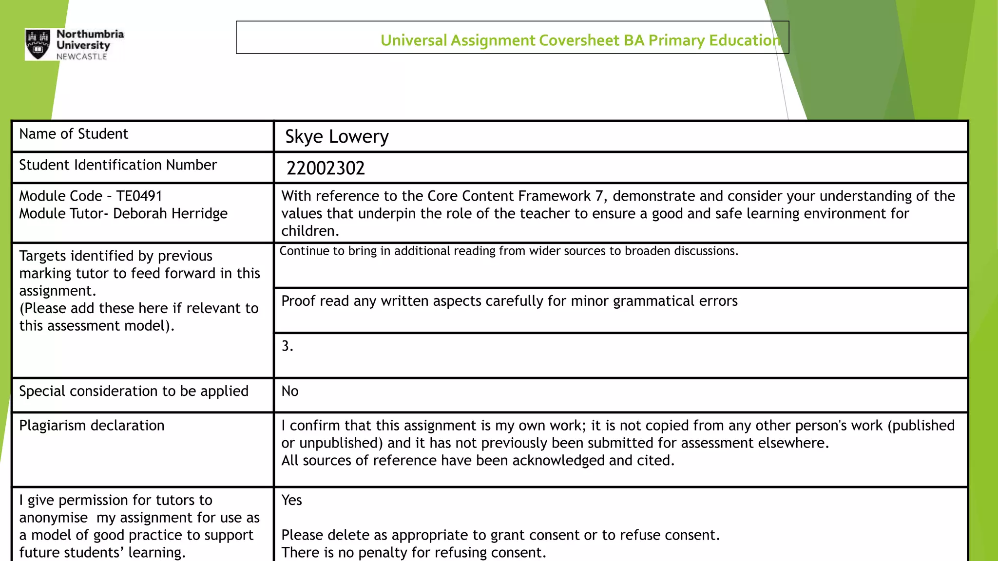 1. The document is a coversheet for a student named Skye Lowery for a module on primary education. It provides instructions to discuss values that underpin a teacher's role in ensuring a good learning environment for children, with reference to Core Content Framework Standard 7 on managing behavior effectively.