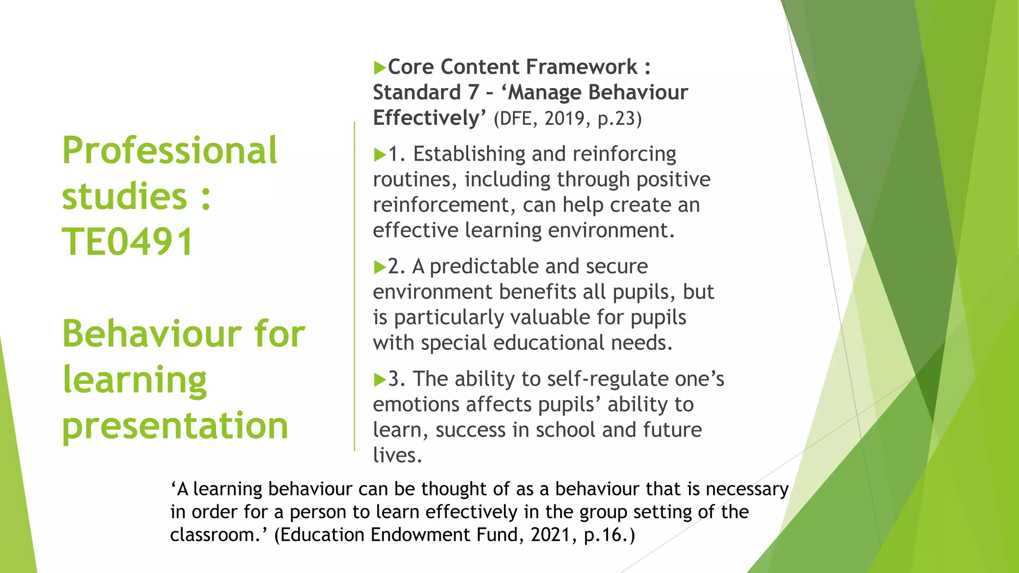 3. The attached document discusses concepts like establishing routines, creating predictable environments, developing self-regulation, the importance of student-teacher relationships, and use of positive reinforcement to improve behavior and learning.