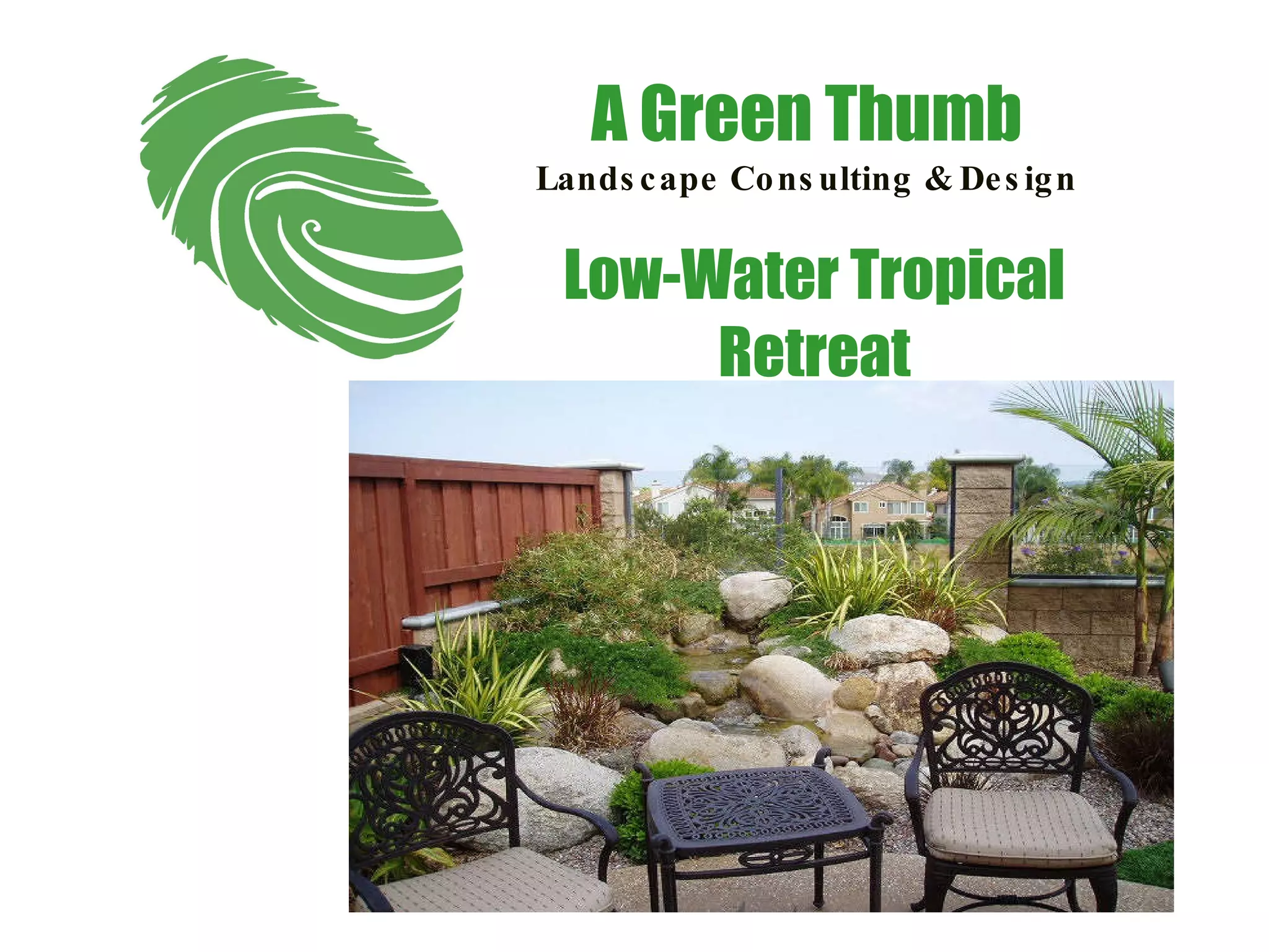 The document appears to be promotional material for A Green Thumb Landscape Consulting & Design, highlighting their services related to low-water and tropical landscaping solutions. It includes contact information and emphasizes their expertise in landscape design. The document is dated between 2005 and 2010.
