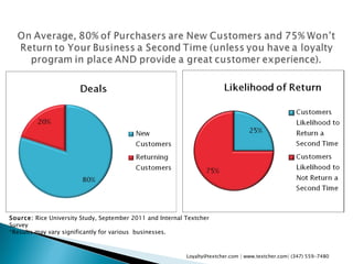 The document outlines strategies for retaining new customers and enhancing business growth through loyalty programs, emphasizing the importance of keeping existing customers over acquiring new ones. It provides recommendations such as offering exclusive deals, encouraging social sharing, and maintaining direct communication with customers. Additionally, the document highlights the significance of engaging content and customer service in fostering long-term customer relationships.