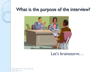 The document provides tips and strategies for maximizing one's performance in a job interview. It discusses presenting a unique positioning statement, crafting an elevator speech, researching the company beforehand, following interview protocol, answering tough questions, bringing work samples or a portfolio, discussing compensation appropriately, and sending a thank you note after the interview. The overall goal is to determine the candidate and job's fit, make a connection, and progress to the next steps of getting hired.