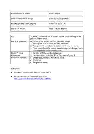 The document outlines a 60-minute English lesson for Year 9 students focusing on comic styles, with the aim of revising and practicing understanding of present perfect tense. The lesson includes a Prezi presentation explaining comic features, an activity where students work in pairs to construct dialogue for a comic strip, and a closing review of the main points.