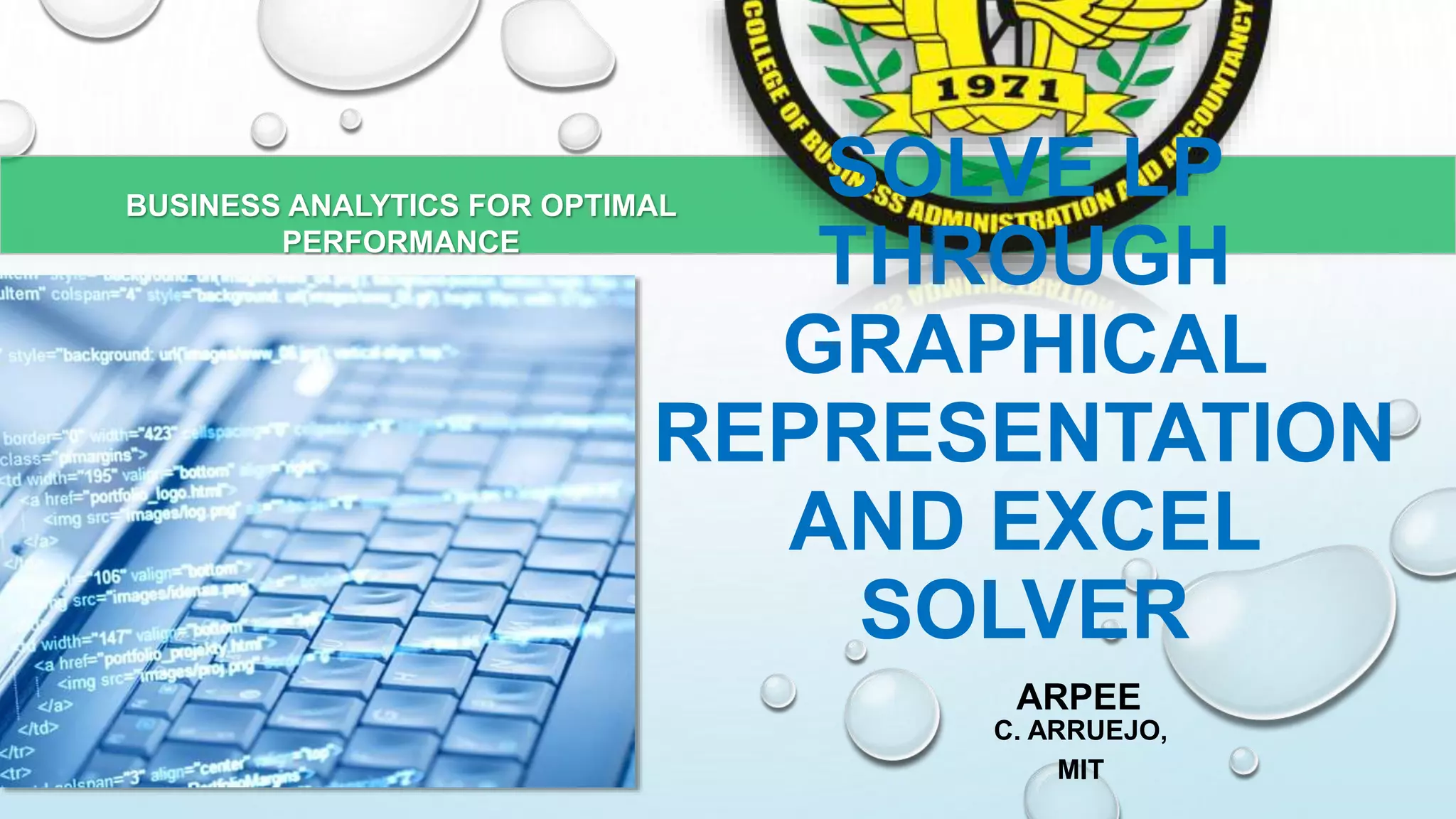 The document describes solving a linear programming problem through graphical representation and Excel Solver. It provides an example of a farmer who wants to maximize profits by deciding how many hectares to plant with wheat and barley, given costs, profits, land and labor constraints. The problem is formulated with decision variables for wheat and barley area, an objective function to maximize total profit, and constraints for budget, labor and total land area. The optimal solution is found to be planting wheat on 60 hectares and barley on 20 hectares, yielding maximum profit of $8,400.