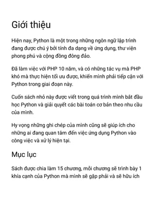 This document provides examples of Python code snippets covering various topics like Python basics (print, variables, data types), conditional statements (if-else), loops (for, while), functions, object oriented programming (classes, inheritance), file handling, modules, database connectivity (MySQL, Redis), XML/HTML parsing and web scraping. It also shows code for installing and importing various third party Python libraries and modules.