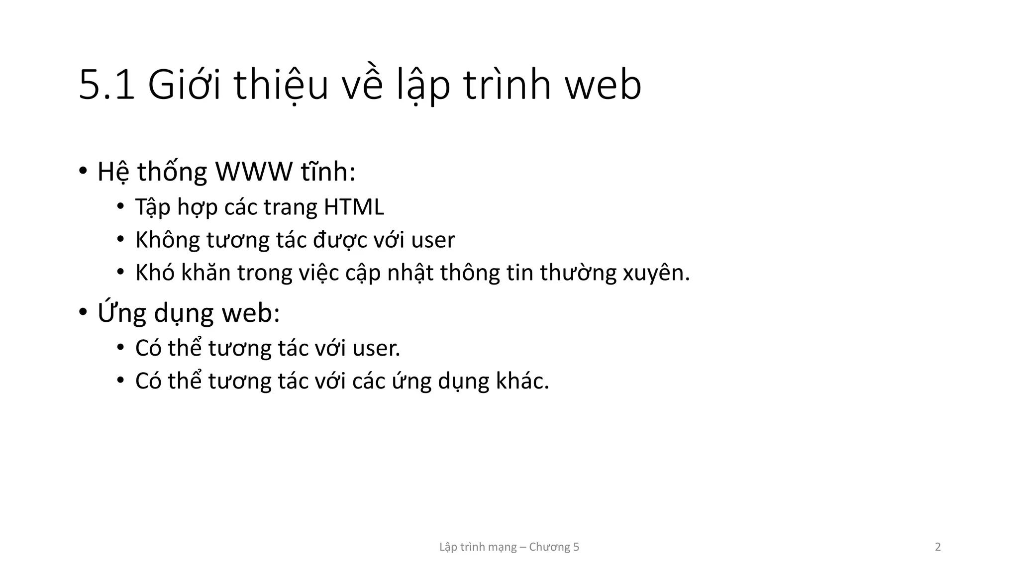 Chương 5 về lập trình mạng giới thiệu lập trình web thông qua CGI, HTML, và các phương pháp tương tác với người dùng. Nó trình bày chi tiết về cấu trúc HTML, các thẻ cơ bản, và việc sử dụng forms để thu thập thông tin từ người dùng. Chương cũng đề cập đến lập trình phía client bằng JavaScript, Java applets và DHTML để tạo ra các ứng dụng web tương tác.