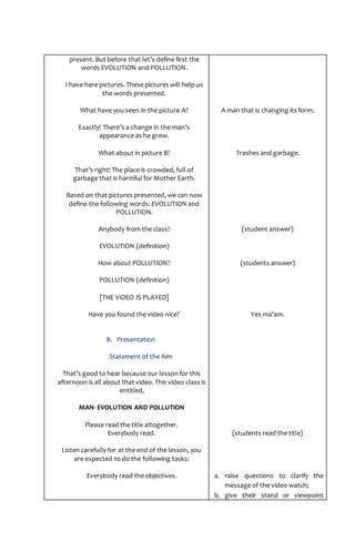 The document outlines a lesson plan about the topics of evolution and pollution. The lesson involves students watching a video about how human progress has impacted the environment. The objectives are for students to ask clarifying questions about the video, defend whether mankind has caused irreversible damage to nature, and write a letter advising the main character. The lesson plan describes introducing the topics, showing the video, discussing it in groups, and debating if human impact on nature is reversible or not. Students are then asked to write a letter advising the main character on caring for the environment.