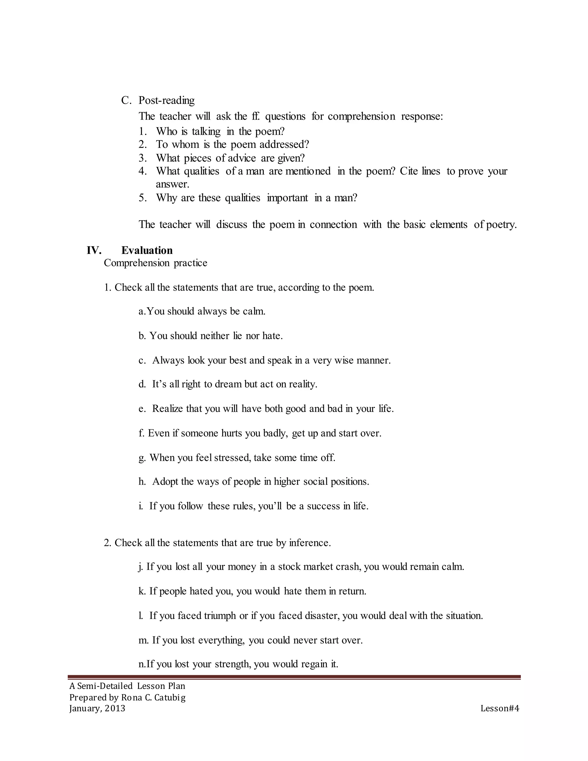 This lesson plan aims to teach students about the elements of poetry through analyzing Rudyard Kipling's poem "If". The objectives are for students to give antonyms of words, identify poetic elements, and explain the meaning of the poem. Students will develop vocabulary, discuss the meaning of "If" in songs, read the poem aloud, and answer comprehension questions. They will analyze the poem's connection to poetic elements and complete a true/false evaluation. For homework, students will list ways to improve themselves.