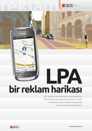 LPA- Lokasyon Bazlı Reklamcılık ile akıllı telefonlara ve GPS cihazlarına lokasyon bazlı reklamlar verebilir, müşterilerinizi doğru noktaya veya kişisel özel kampanyalara yönlendirebilirsiniz.