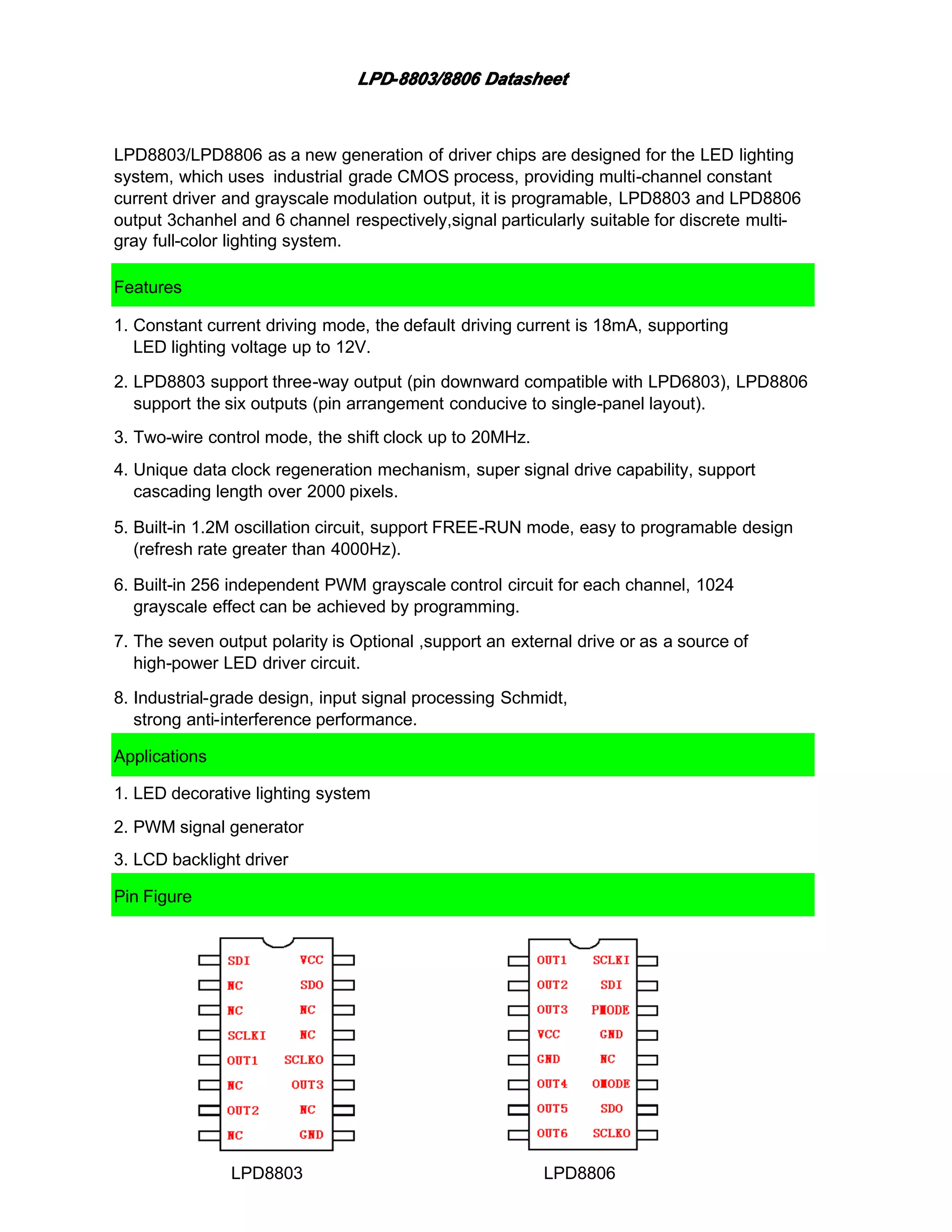 The LPD8803 and LPD8806 are advanced driver chips for LED lighting systems, offering multi-channel constant current drivers and grayscale modulation outputs. They support up to 12V LED voltage, feature programmable outputs, and include built-in PWM grayscale control with a data clock regeneration mechanism. These chips are suitable for applications in decorative lighting and LCD backlight drivers, with specifications for cascading connections and operational modes for various LED configurations.