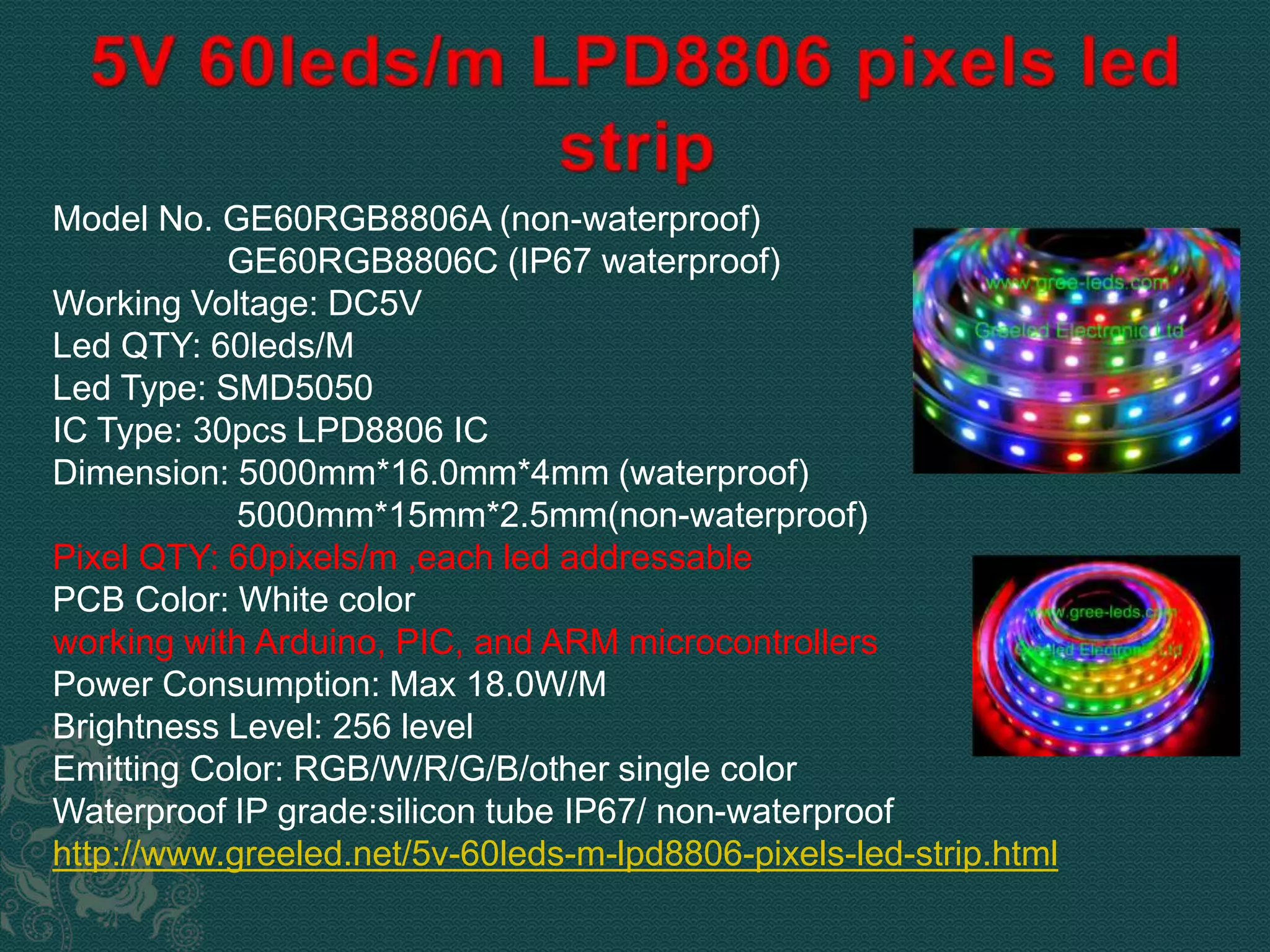 Greeled Electronic Ltd. manufactures a range of digital LED products, including waterproof and non-waterproof strips and modules suitable for microcontrollers like Arduino. Key specifications include working voltages of DC5V or DC12V, various LED and pixel quantities, and a maximum power consumption of 18.0W/m. The products feature addressable pixels with 256 brightness levels and come in multiple color configurations, with IP67 and IP68 waterproof ratings available.