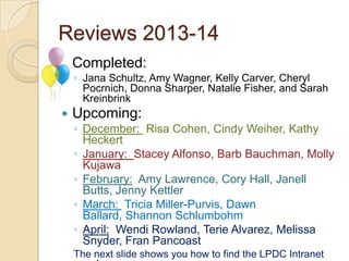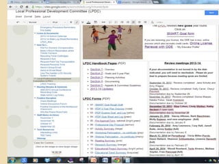 This document provides an update on professional development activities at the school. It summarizes completed and upcoming teacher reviews by the Licensed Professional Development Committee (LPDC). It also outlines upcoming training sessions in January and notes requirements for teachers renewing their licenses. The document discusses adjustments the LPDC has made to better meet teacher needs, such as removing limits on activity categories and creating new forms. It aims to demonstrate that fulfilling professional development requirements can be achieved in a flexible manner through activities like attending in-services, participating on committees, and developing educational projects.