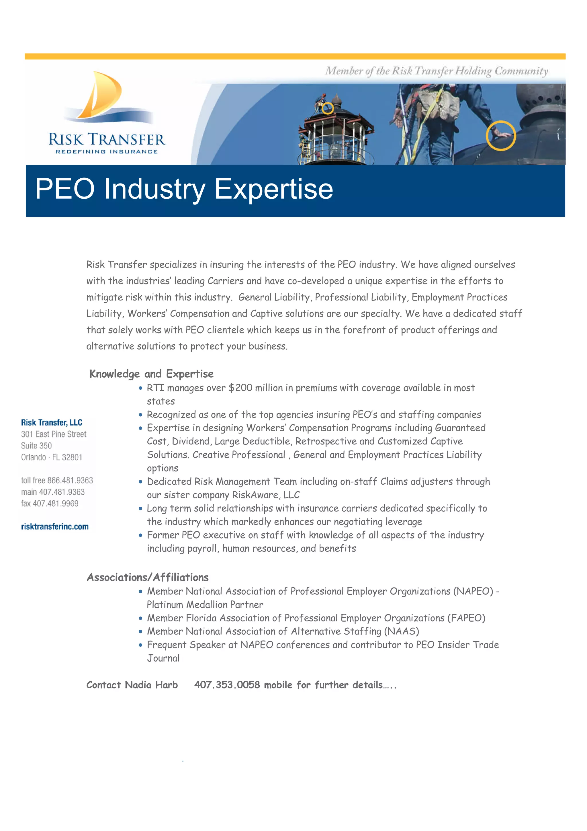 The document outlines a company specializing in insuring the Professional Employer Organization (PEO) industry, emphasizing its expertise in risk transfer and a range of insurance products including general and professional liability, and workers’ compensation. With over $200 million in managed premiums and a dedicated staff, the firm aims to provide tailored solutions while leveraging strong relationships with insurance carriers. The company is recognized for its industry knowledge, membership in key associations, and active participation in conferences.