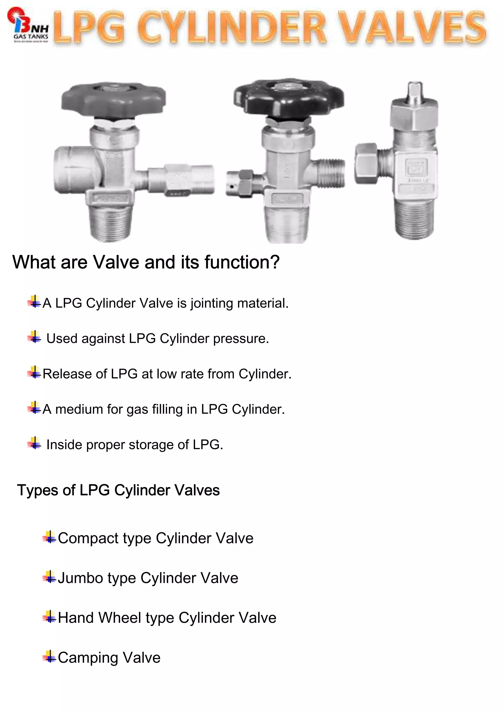 LPG cylinder valves control the release of gas from cylinders and come in various types such as compact, jumbo, and camping valves. They offer features like advanced design, durability, and safety measures, including keeping cylinders upright and not using oil on regulators. For more information, contact BNH Gas Tanks or visit their website.