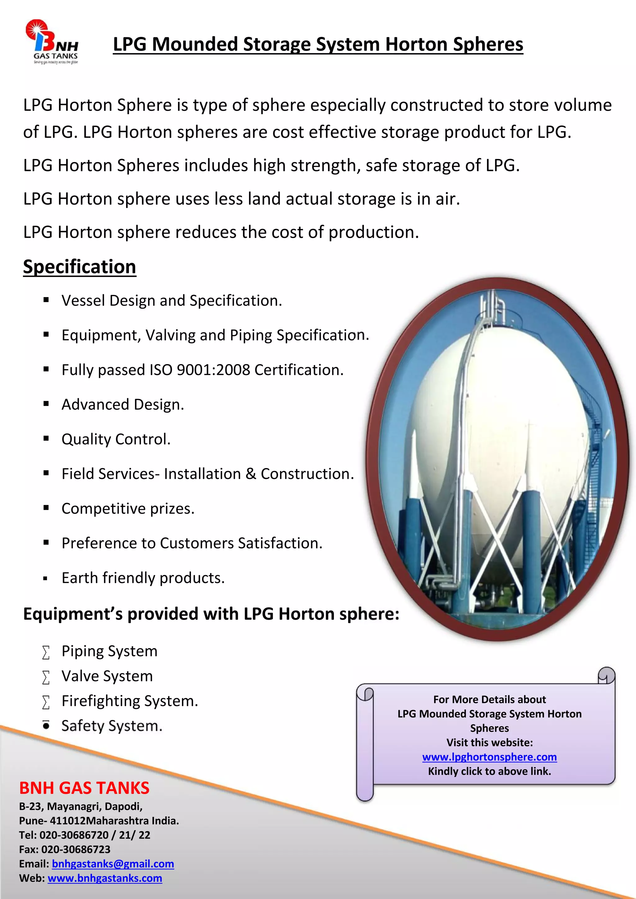 LPG Horton spheres are cost-effective structures for storing liquefied petroleum gas (LPG) that use less land area than traditional storage. They consist of high strength spheres that provide safe above-ground LPG storage. Equipment included with LPG Horton spheres are piping, valve, firefighting, and safety systems. They are competitively priced and aim to satisfy customers.