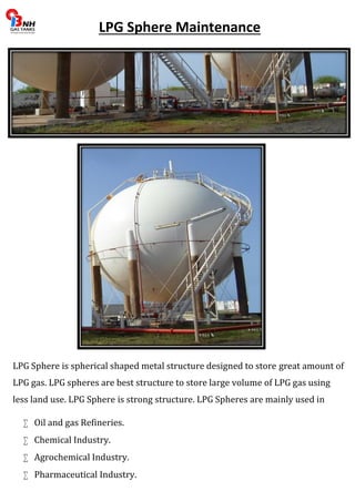 LPG spheres are metal structures designed for the efficient storage of large volumes of LPG gas, primarily used in various industries like oil and gas refineries and pharmaceuticals. Proper maintenance of these spheres is crucial for safety, efficiency, and reducing repair costs, involving steps such as inspection, testing, and servicing. For more information on LPG sphere maintenance, additional details can be found at their respective websites.
