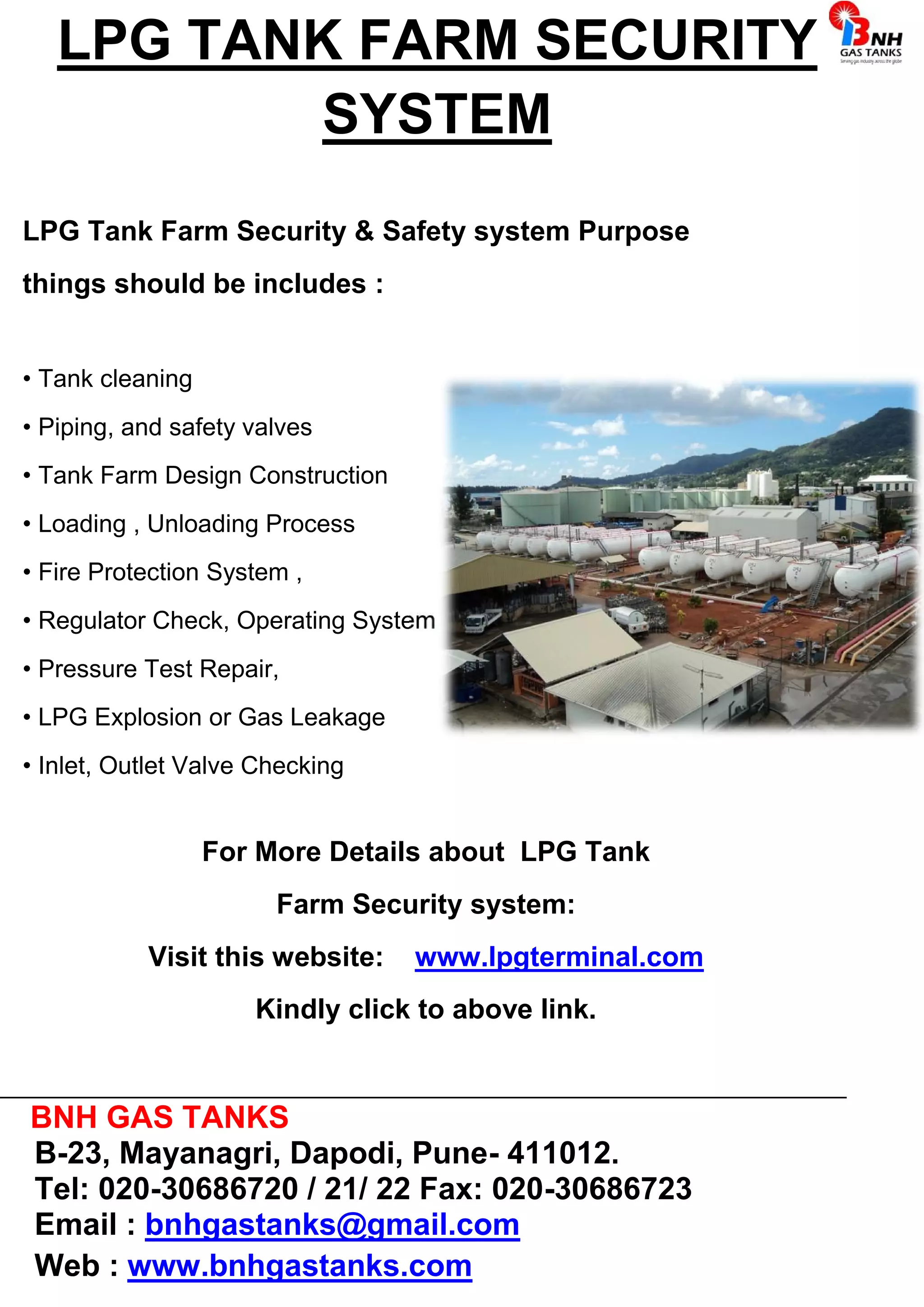 The document outlines the key components of an LPG tank farm security system, including tank cleaning, piping and safety valves, tank farm design and construction, loading and unloading processes, fire protection systems, regulator checks, pressure testing and repairs, addressing LPG explosions or gas leaks, and inlet and outlet valve checks. It directs the reader to visit the website www.lpgterminal.com for more details on LPG tank farm security systems.