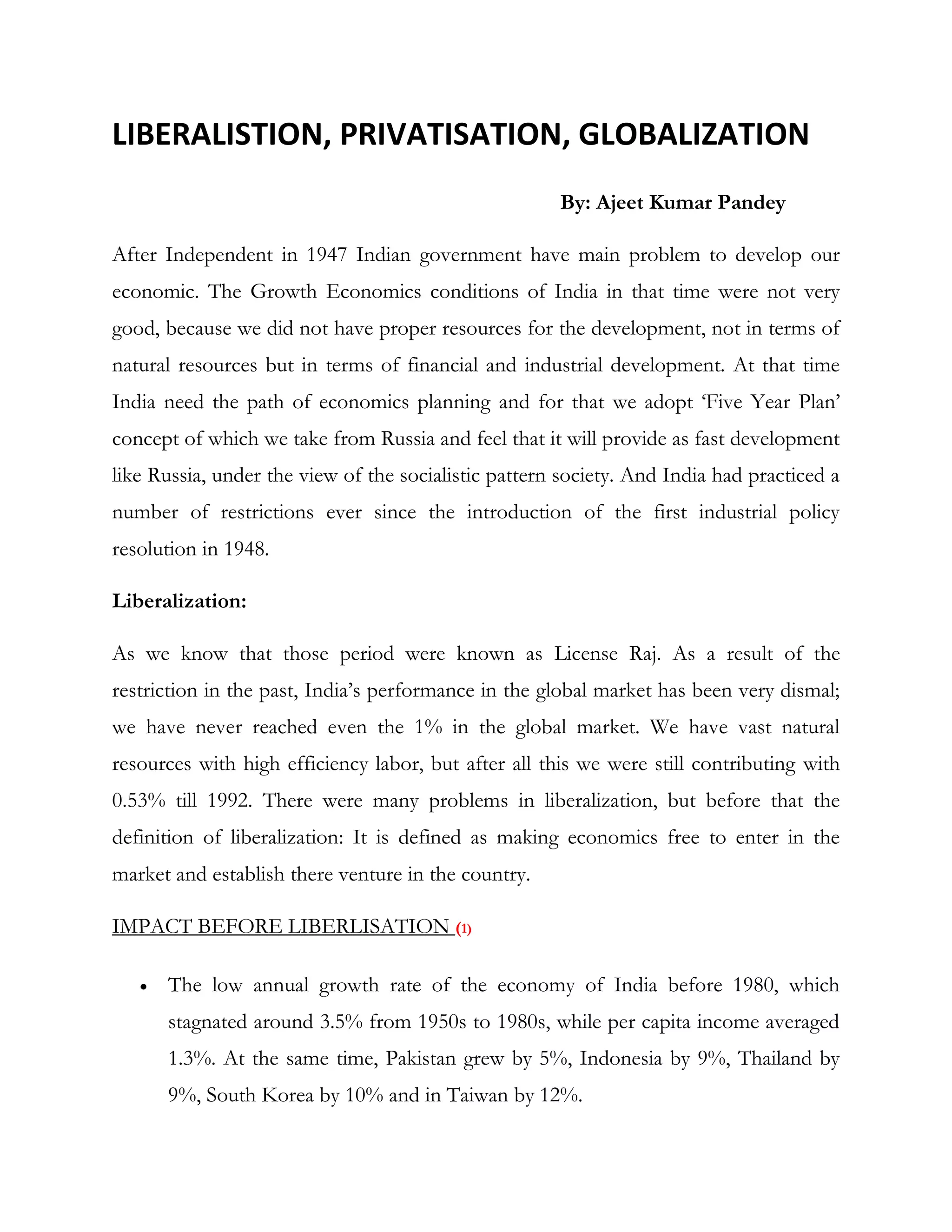 The document discusses the economic development of India from 1947 to present. It summarizes that India adopted a socialist model with licensing and restrictions after independence which led to low growth rates of around 3.5% until the 1980s. Liberalization in the 1990s removed many licenses and restrictions, allowing private companies to enter markets. Privatization further shifted control from public to private sectors, accelerating growth. India is now one of the fastest growing economies and on track to be a top economy by 2050. However, critics argue the development model focuses too much on large corporations and imports over job creation and small/medium businesses.