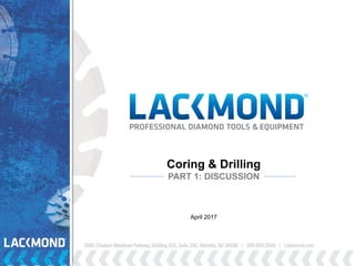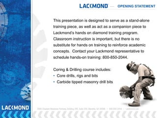This document provides an overview and training on coring and drilling. It discusses safety procedures and required protective equipment. It then reviews various coring and drilling tools, including their features and uses. The document focuses on diamond core bits, explaining different types for various applications. It also covers carbide drill bits, their drive systems, and applications for installing mechanical and chemical anchors. Hands-on training is recommended to reinforce concepts from the classroom instruction.