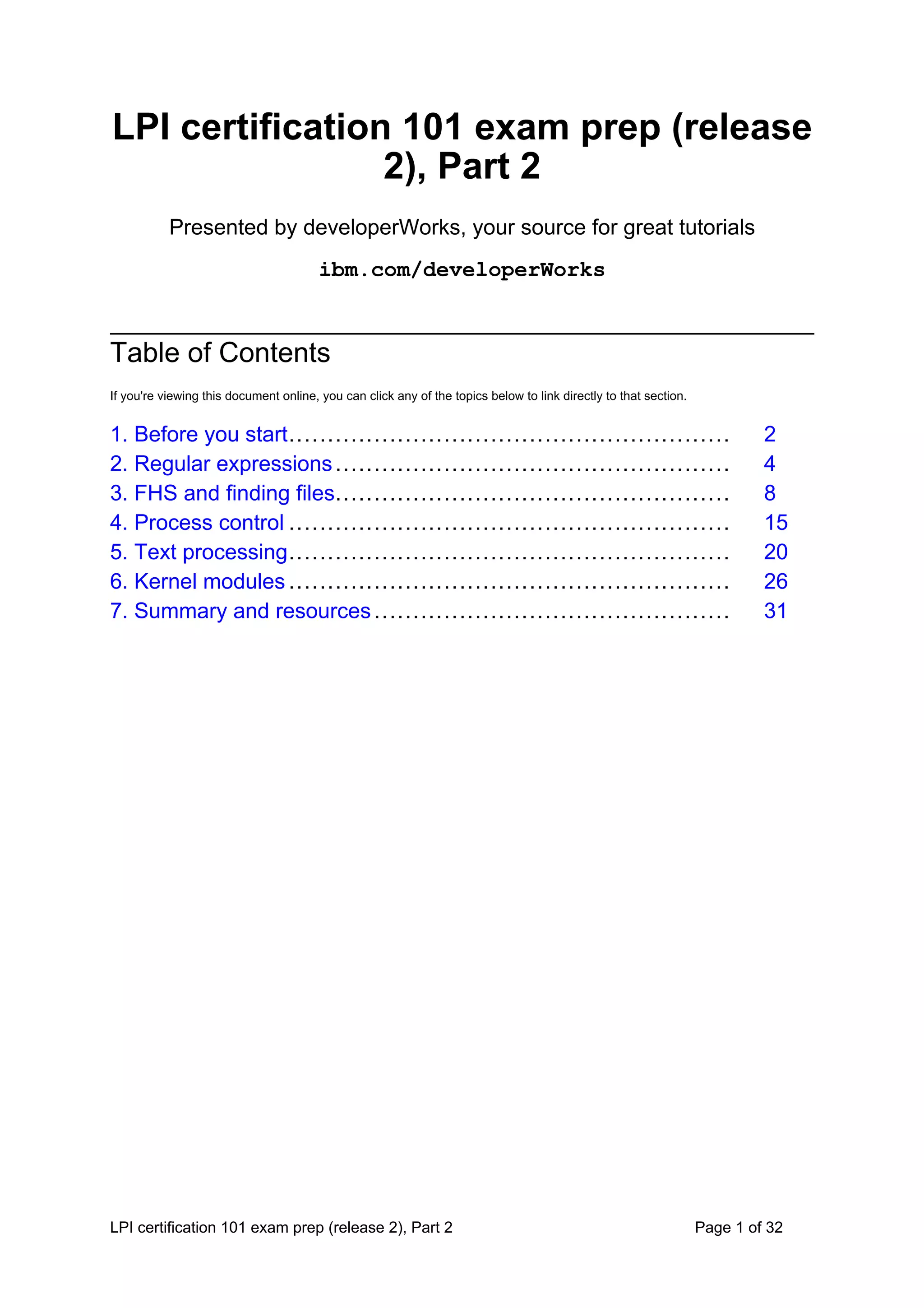 This document provides an overview of basic Linux administration skills needed to prepare for the Linux Professional Institute's 101 certification exam. It discusses regular expressions for searching files, the Filesystem Hierarchy Standard for organizing directories, and tools for finding files on a Linux system. The tutorial covers using regular expression metacharacters like ., [], *, ^, and $ to match patterns in text. It explains the FHS specifications for separating shareable, unshareable, static, and variable files into directories like /usr, /etc, /var, and /opt. Finally, it introduces finding files using the PATH, locate, find, and whereis commands.