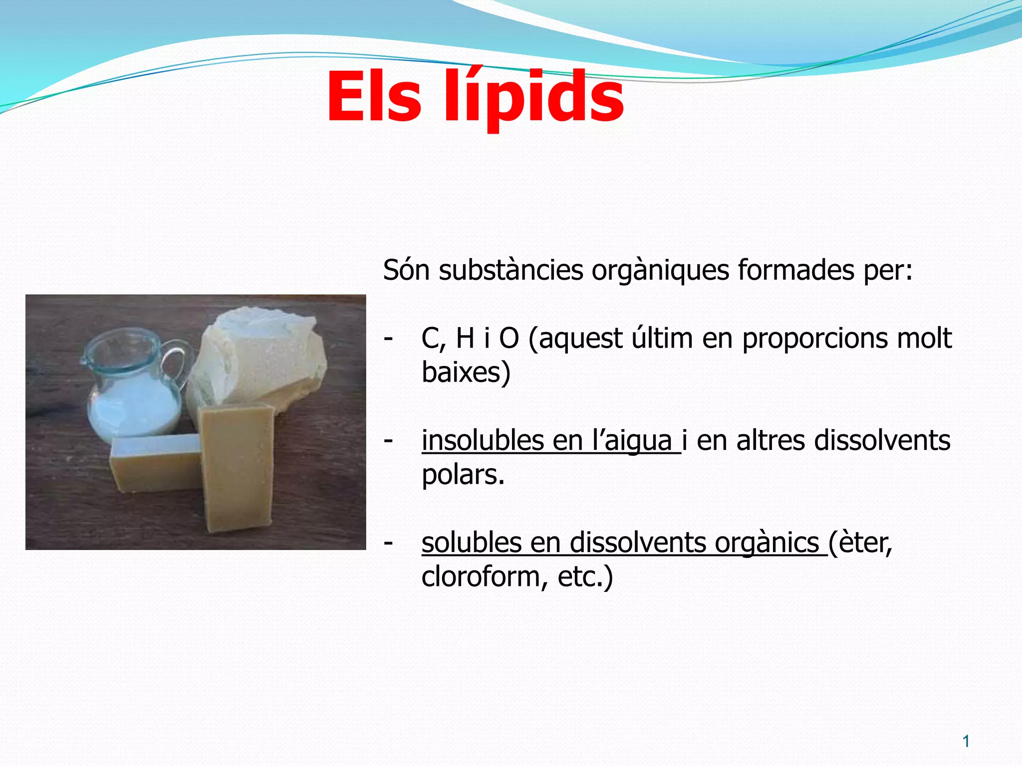 12Elslípids saponificablesHololípids, lípidssimples o greixos: acilglicèridsEstàn mancats de polaritat. Per això s’anomenen greixos neutres.Aquest enllaç es pot trencar per:- Hidròlisi: trencament d’un enllaç orgànic en presència d’aigua i potenciat per temperatura, presència de àcids o de sals- Saponificació: fer bullir-los en hidròxid sòdic o potàssic donant lloc a un sabó