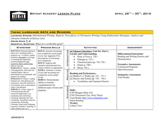 The lesson plans outline activities for language arts and reading for the week of April 26th-30th. Students will analyze elements of literary texts such as point of view, dialogue, characterization, and plot. They will read short stories about Madam C.J. Walker and Damon and Pythias and discuss vocabulary and grammar. Assessment will include constructed responses, open discussion, and a total reader assessment. Daily activities incorporate CNN blogging, discussions, silent reading and weekly visits to the library.