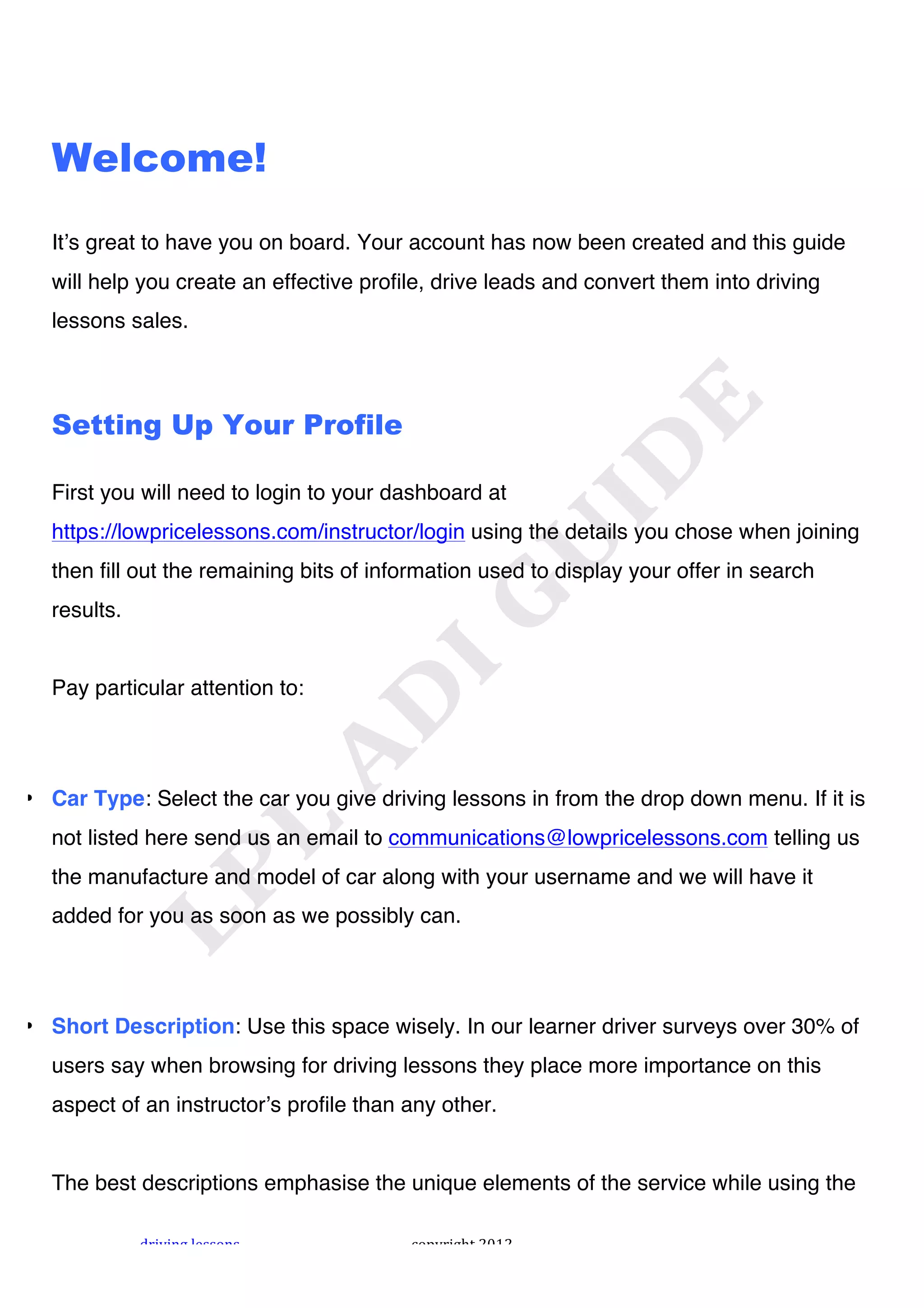 This document is a guide for newly registered driving instructors on how to effectively set up their profiles on the Low Price Lessons platform to attract leads and convert them into sales for driving lessons. It emphasizes the importance of a well-crafted profile, including specific instructions on filling out key sections like car type, description, and logo, as well as optimizing performance through analytics. Additionally, it highlights the benefits of upgrading to a pro account, which offers enhanced features and guarantees for increasing student leads.