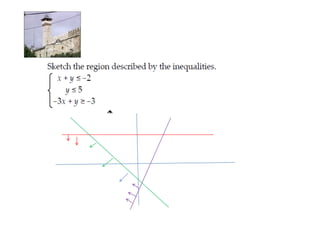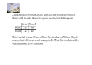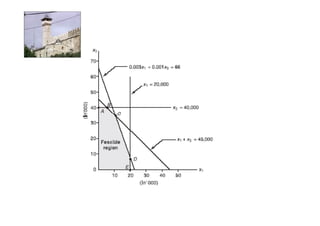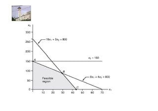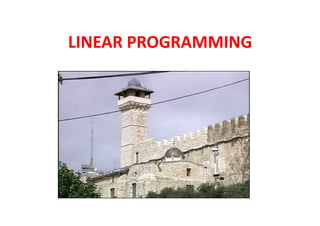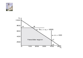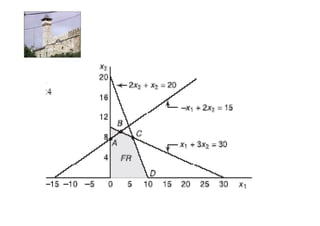 Linear programming is a technique for optimizing allocation of limited resources to activities based on constraints and an objective function. The key steps are to represent constraints graphically, identify the feasible region, and determine the optimal point that maximizes/minimizes the objective function value within the feasible region. Solving a linear programming problem graphically involves plotting the constraints and objective function on a coordinate plane and finding their intersection points.