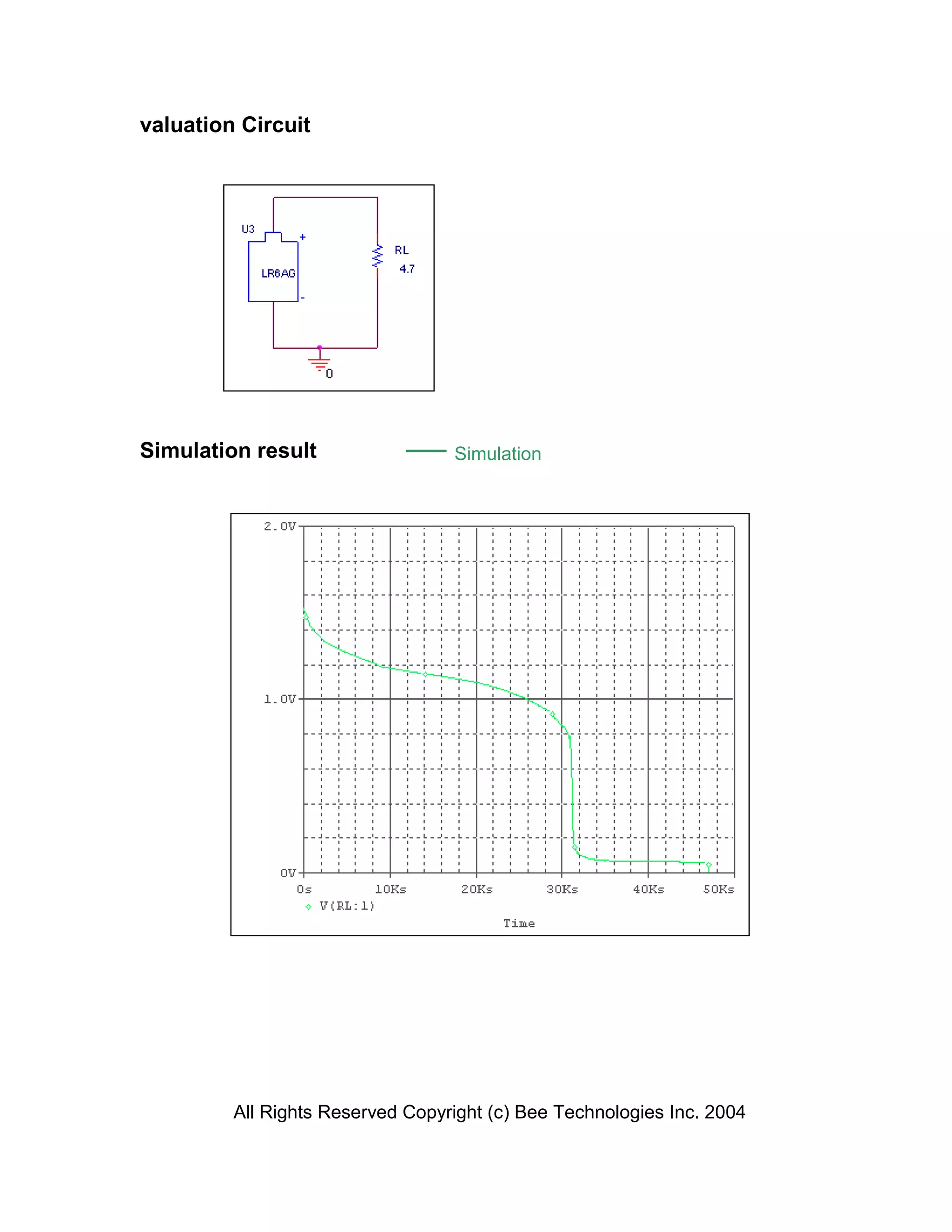 This document summarizes the results of a device modeling report. It includes the components tested (alkaline battery), part number (LR6AG), manufacturer (TOSHIBA), and simulation results comparing voltage measurements over time to simulated voltage values, reporting the percentage error between the two. Voltage values were measured and simulated at 47 time intervals between 0.1 and 47 kiloseconds.