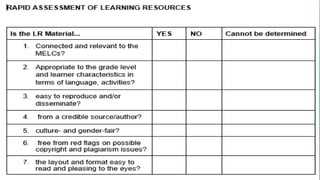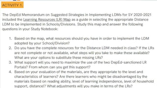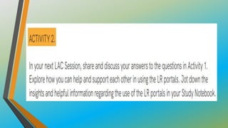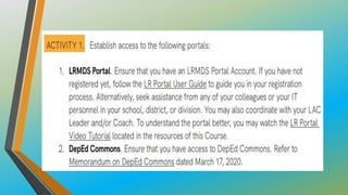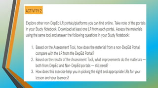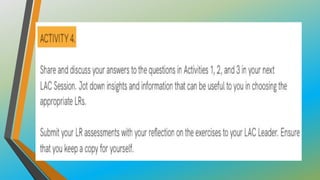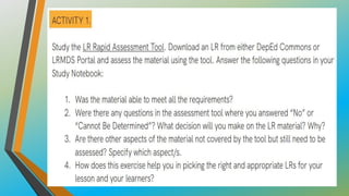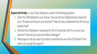 This document provides an overview of Module 3B which focuses on learning resources for distance learning. It contains 3 lessons that aim to help teachers 1) map learning resources to specific learning modalities, 2) access resources from DepEd portals like DepEd Commons and the Learning Resource Portal, and 3) assess the quality and appropriateness of learning resource materials. The module objectives are to associate learning resources with learning modalities, access quality-assured resources from DepEd portals, and explain the importance of using quality learning resources. Key topics include distance learning, learning resources, resource maps, and distance learning subcategories.