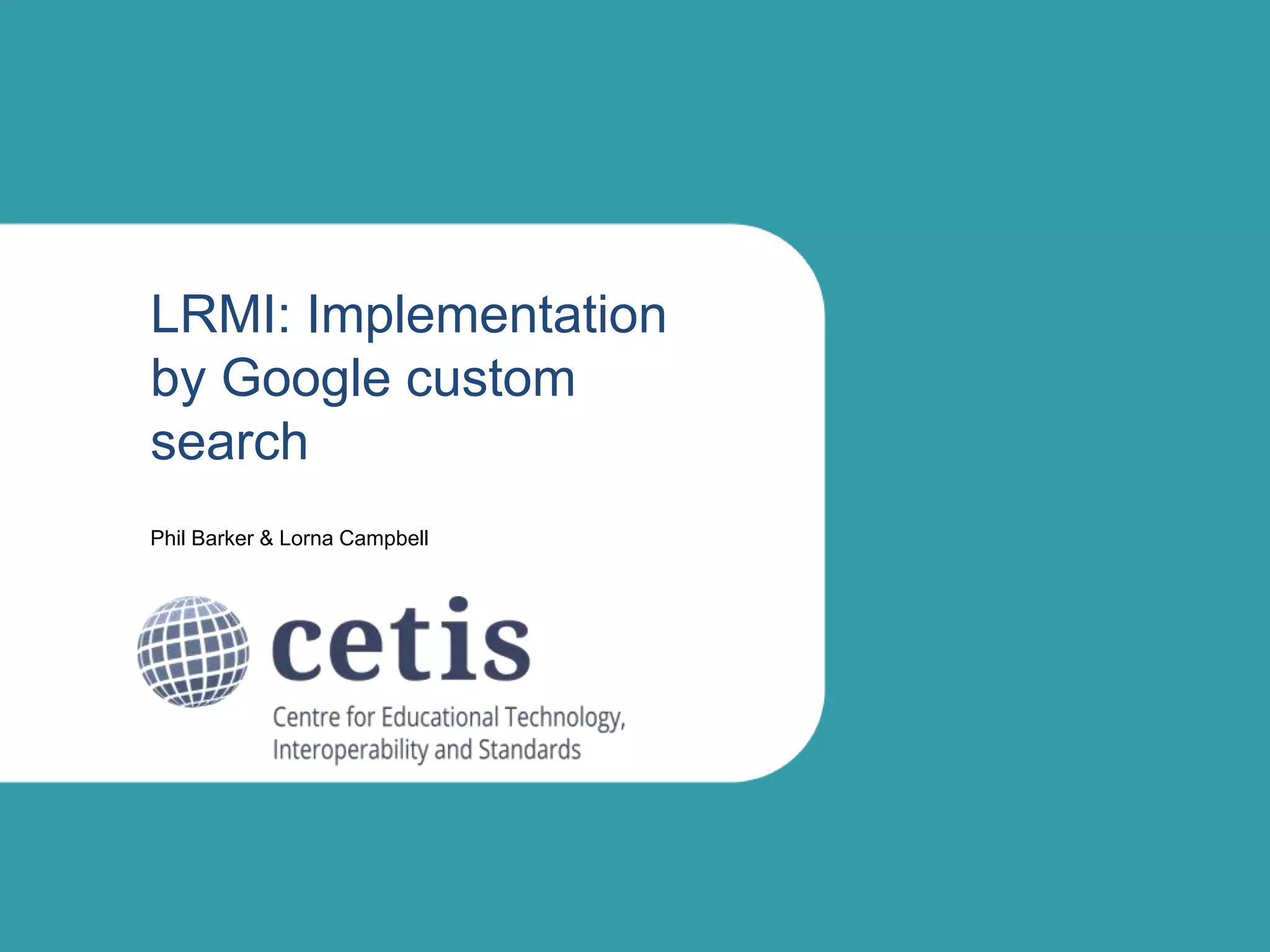 LRMI (Learning Resource Metadata Initiative) enhanced schema.org to better support open web searching for learning resources by adding educational parameters. Google custom search allows limiting searches to pages with specific schema.org types and properties, such as alignment with particular educational frameworks. The presentation demonstrates a prototype Google custom search using LRMI parameters to search for resources aligned with GCSE standards.