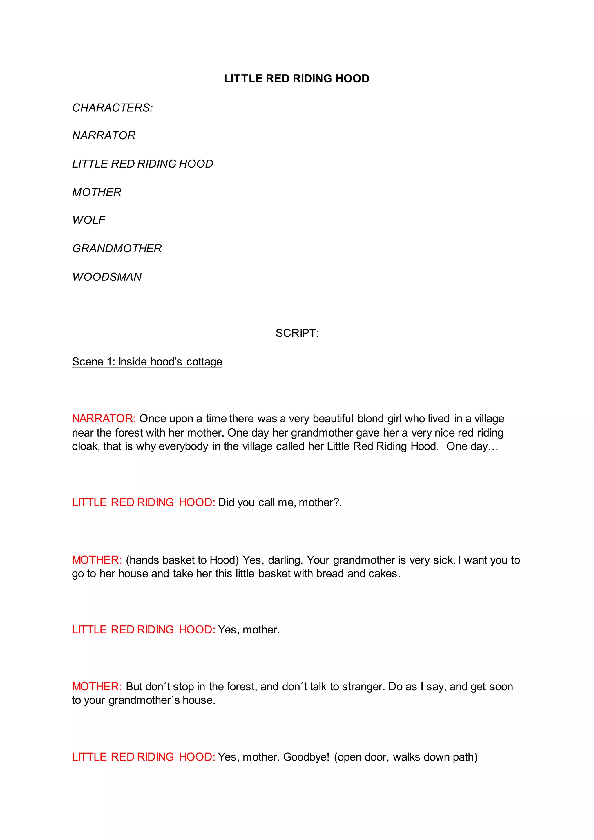 Little Red Riding Hood is sent by her mother to bring a basket of goods to her sick grandmother. On the way, she meets a wolf who tricks her into revealing where her grandmother lives. The wolf arrives first and eats the grandmother. He then waits in her bed for Little Red Riding Hood. When she arrives, the wolf tries to eat her too but is stopped by a woodsman. The wolf apologizes and Little Red Riding Hood learns not to talk to strangers or disobey her mother.