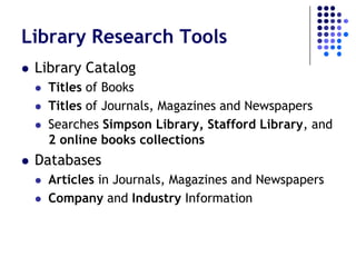 This document provides research tips and an overview of library resources for a production and operations management course at the University of Mary Washington, including a description of the library catalog and databases, how to access them both on and off campus, and tips for searching and locating journal articles and books along with contact information for getting research help.