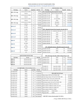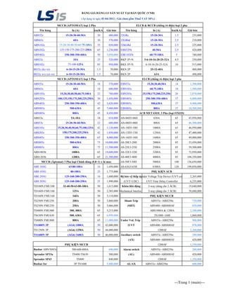 This document provides a price list for electrical equipment manufactured in South Korea, including prices in Vietnamese Dong without VAT. It includes prices for various types of MCCBs, ELCBs, MCBs, switch disconnectors, and ACBs ranging from 5A to 6300A. The document is presented over two pages, with the first page providing details on 2-pole and 3-pole MCCBs, ELCBs, and accessories, while the second page provides prices for MCBs, MCCB trip units, switch disconnectors, and draw-out ACBs.