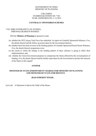 The document provides detailed responses to several questions raised in the Lok Sabha regarding centrally sponsored schemes, including a submitted report by the NITI Aayog task force on these schemes and changes to their funding patterns. It covers various welfare activities, funding for NGOs, and measures for agricultural development, including the allocation for the Pradhan Mantri Krishi Sinchai Yojana. Additionally, it addresses requests for special category status for Andhra Pradesh and other states, highlighting the government's position on these matters.